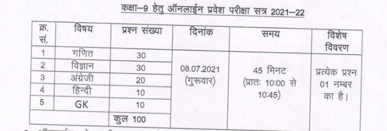 Entrance Online Exam Class-9 will be conducted on 8 July 2021.